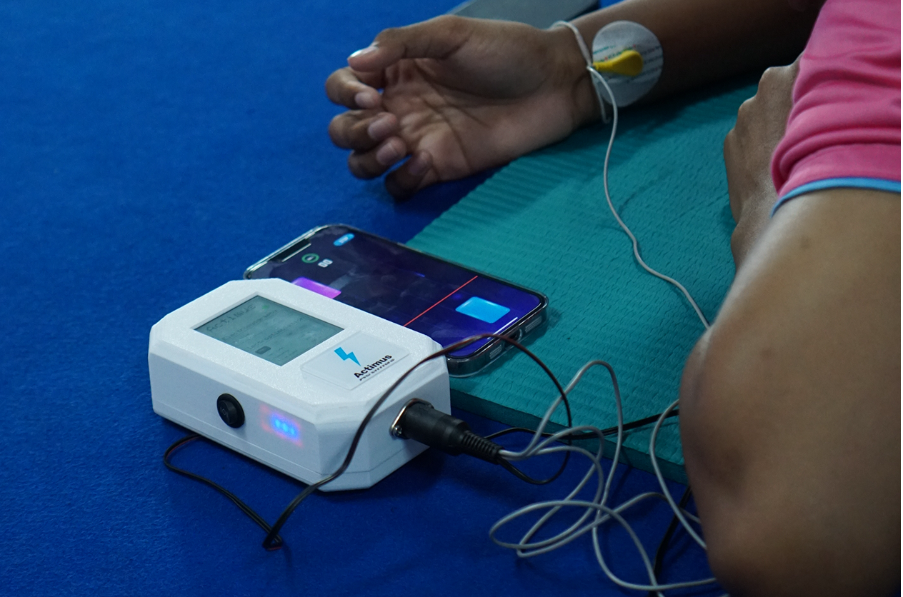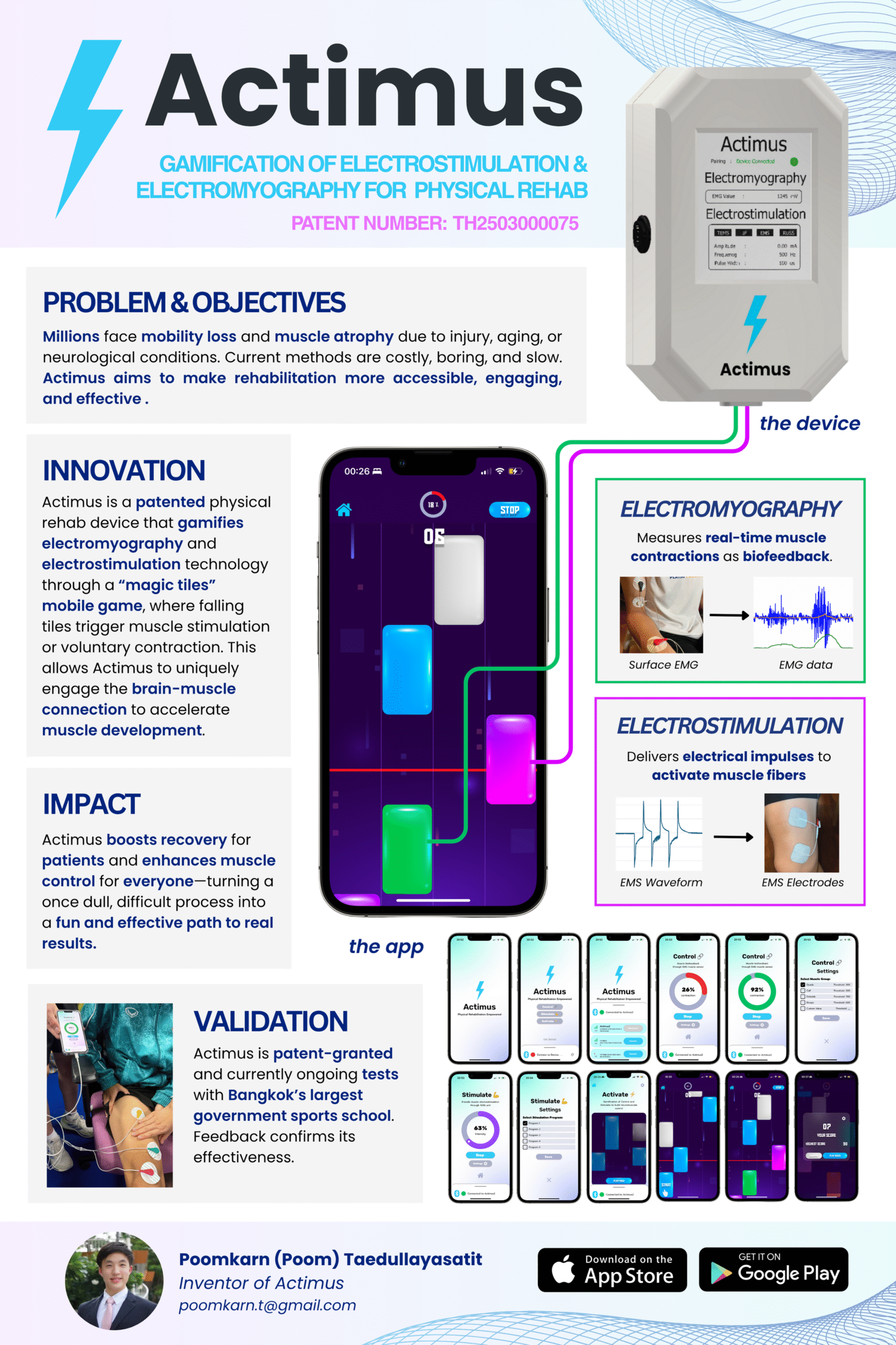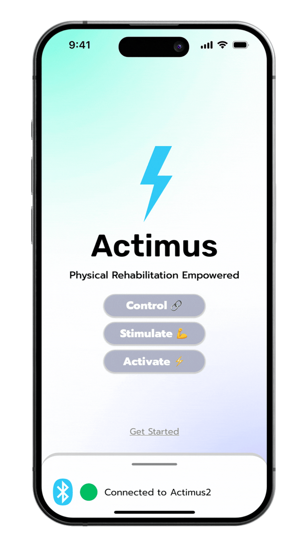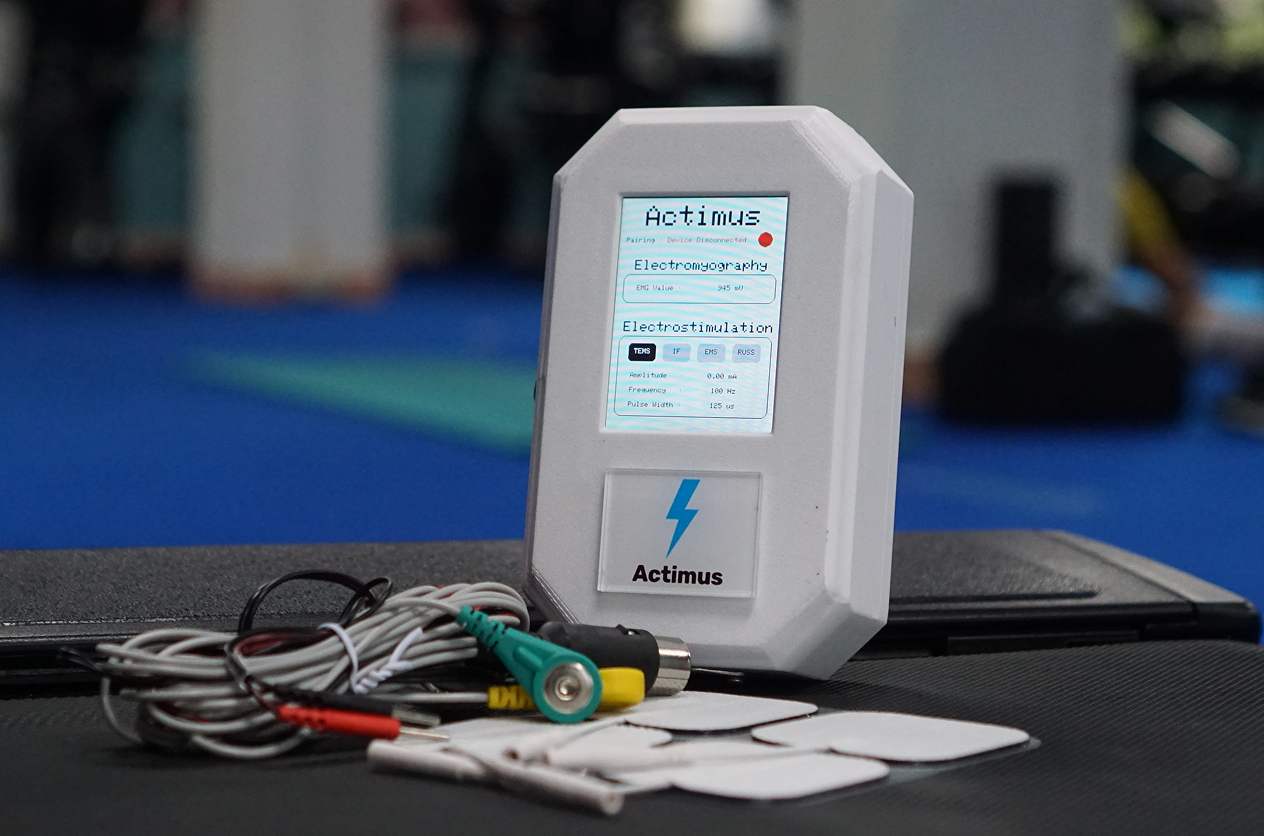 Actimus is a portable, gamified rehabilitation device that combines electromyography (EMG) and electrostimulation (EMS) into a unified system. By merging and gamifying these technologies in a fast-paced Magic Tiles–style application, Actimus integrates biofeedback and stimulation in a way that accelerates neuromuscular control. Our goal is to make muscle strengthening not only effective but also fun, helping everyone recover or stay active in a more enjoyable way.