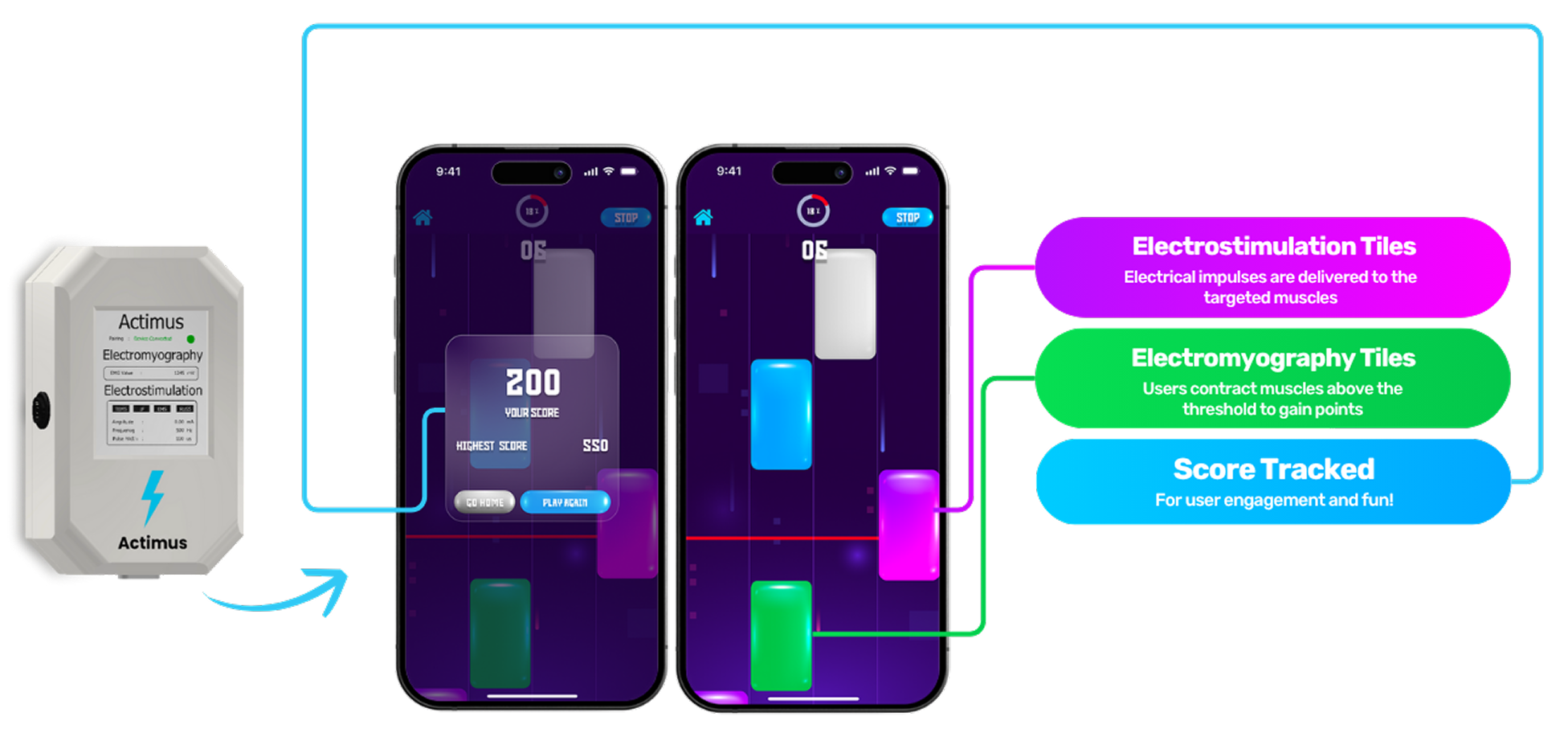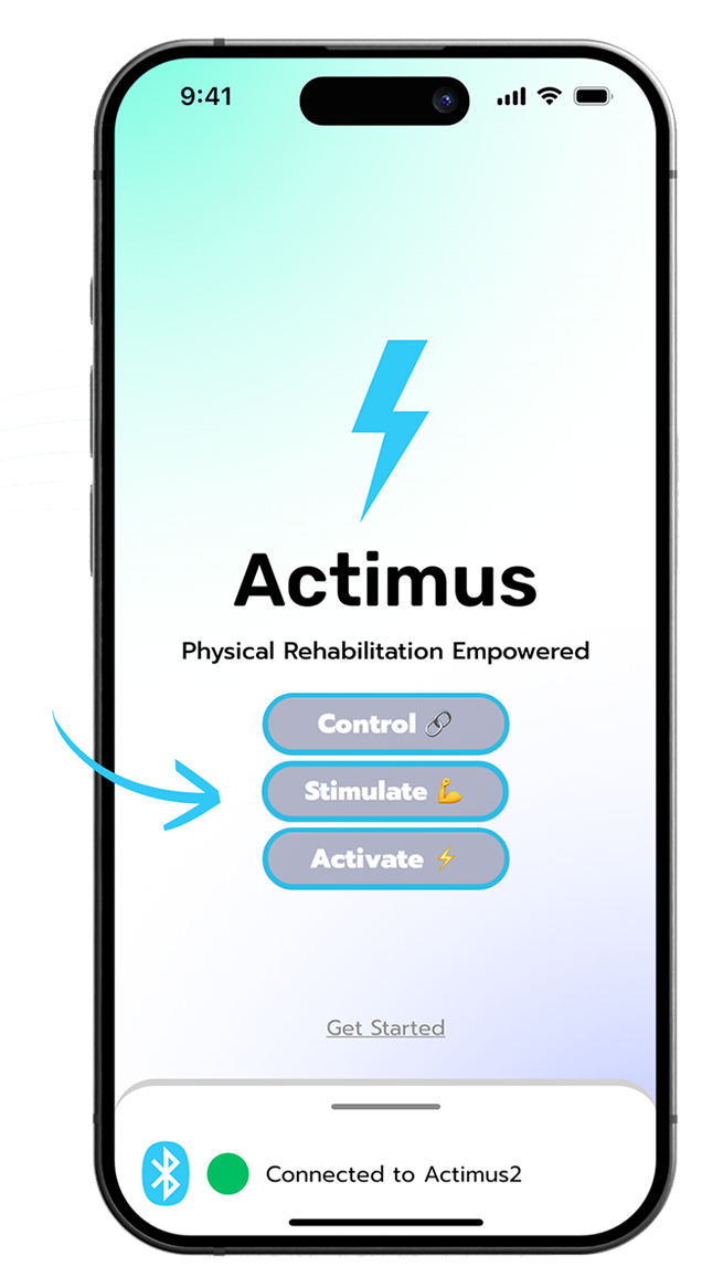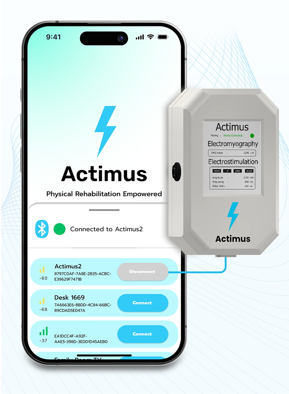 Actimus is a revolutionary physical rehabilitation device that combines and gamifies muscle contraction measurement and muscle stimulation. Paired with a mobile application, users play a magic-tiles-style game that activates muscles and strengthens the brain-muscle connection with pioneering efficiency to enhance physical rehabilitation